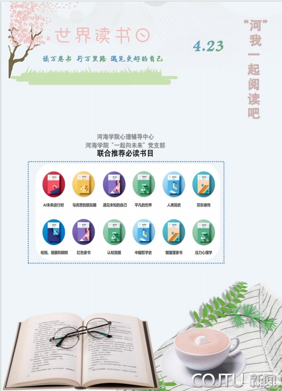 为响应河海学院党委“书香河海”的号召,4月23日,在第29个世界读书日之际,河海学院本科生第一、第七党支部联合学院心理辅导中心开展“一起阅读吧”读书活动,面向支部师生挑选推荐党史类、人文综合类、哲学类、心理学类等图书12本,引导师生共读,共倡共促“爱读书、读好书、善读书”书香育人新风尚。