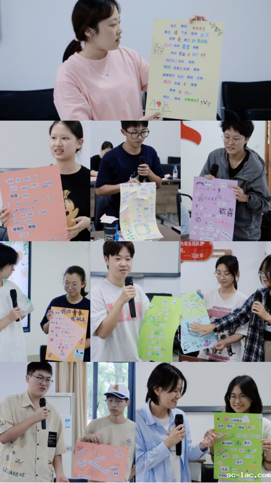 张建欣老师首先请同学们讲解了自己对拼贴诗的理解。“我的主题是廉洁”“我准备以什么是少年为主题”“帮我剪一下美好”“我们这里可以画一个流星”“把‘后悔不已’剪成一个小船,反着贴表示船翻了,他们内心很后悔”......同学们从工作人员提供的文字材料中剪下所需字词,自由地进行诗歌的拼贴,创作出一幅幅寓意深刻的作品。