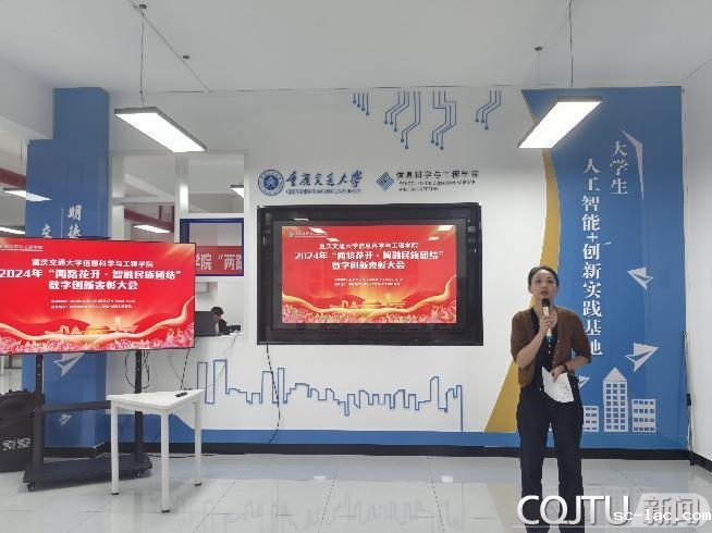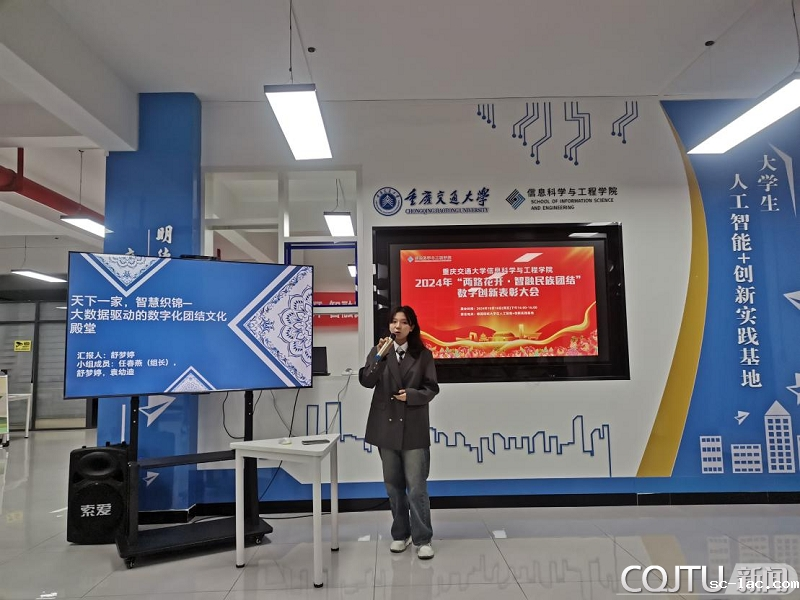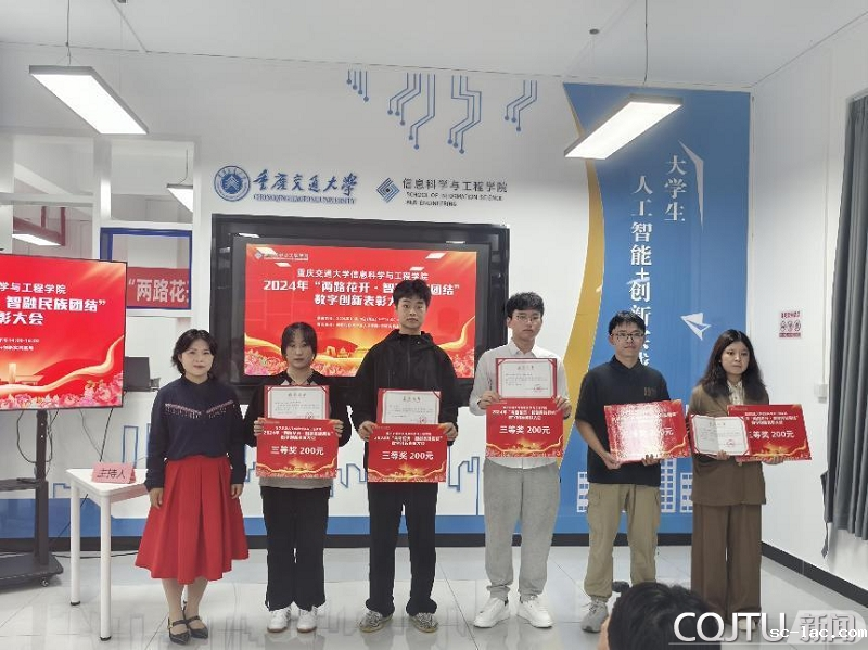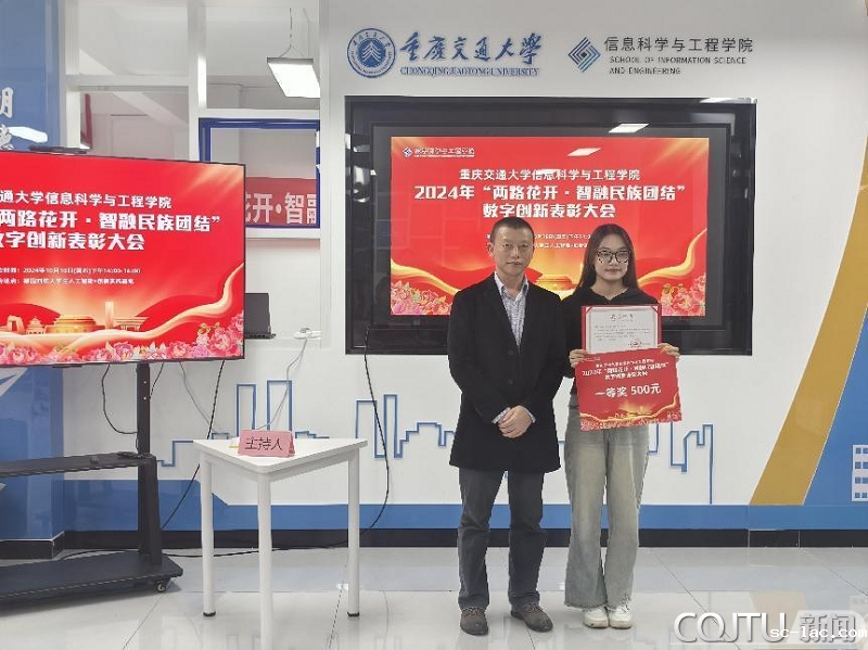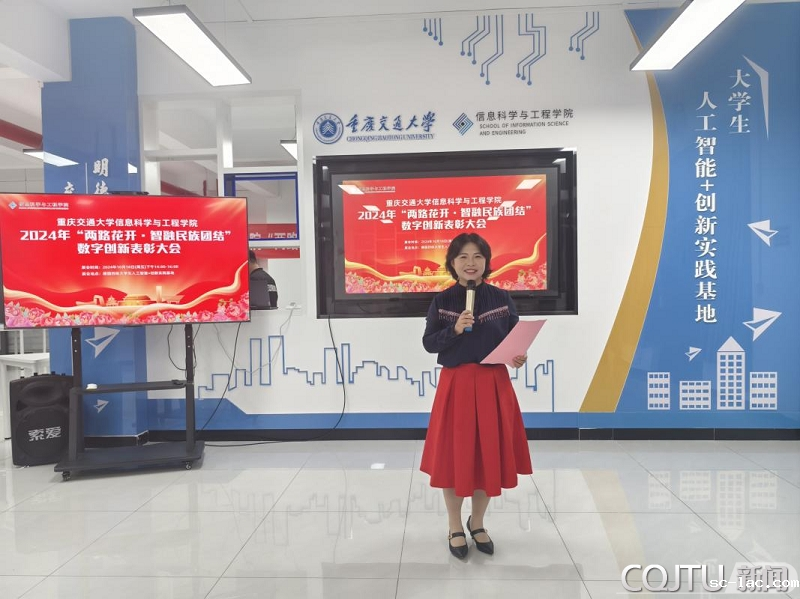 “五十六个星座,五十六枝花,五十六族兄弟姐妹是一家!”表彰大会在《爱我中华》充满欢乐与喜庆的音乐声中拉开了序幕。活动负责人苏琴介绍了活动基本情况和取得的成果。苏琴介绍:今年6月,根据学校统一部署,信息学院积极申报民族团结进步创建项目,结合学院专业特色和学科优势,秉承学校历代传承的“两路”精神,以数字赋能创新为切入口,将数字技术与民族团结进步的主题相结合,精心组织策划了本次活动。活动受到了学生的广泛关注,收到了来自学院不同年级、不同专业、多个民族的同学的参赛作品,作品涵盖了人工智能、大数据、物联网等多个技术领域,从文化传承与交流、人与自然和谐发展、生态环境保护、数字农业发展等多个角度探索研究,充分展示了同学们的创新思维和实践能力。经过专家评审团的评审,最终评选出了九组优秀获奖作品,在表彰大会上予以表彰。
