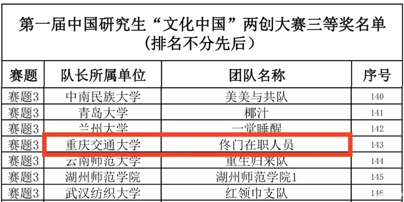 此次获奖是我校积极推动研究生参与学术竞赛和创新活动的成果,它激励着更多的学生积极投身于学术研究和创新实践中,为“赓续中华文脉、坚定文化自信”贡献力量。
