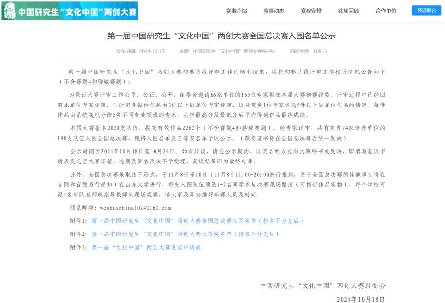 近日,第一届中国研究生“文化中国”两创大赛结果揭晓,我校旅游与传媒学院研究生(熊伟、王文文、李蕊逸、李渔)凭借出色的表现荣获全国三等奖,为学校争得荣誉。