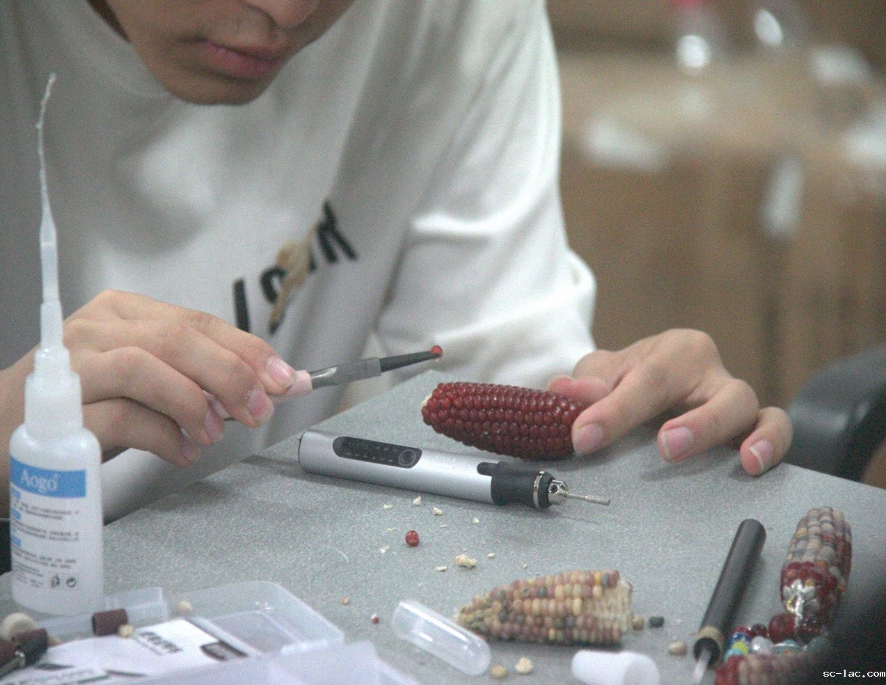 在实际操作过程中,学生们充分发挥了各自的创意与想象力。他们根据玉米的不同形态、色泽和纹理来设计和制作作品。有的学生通过对玉米进行简单的打磨和抛光来展现其天然之美;而有的学生则使用雕刻工具在玉米表面刻制复杂的图案,并通过钻孔、串线、装饰等工艺,使每件作品都独具特色。经过几小时的努力,一件件精美的文玩玉米成品在学生们手中诞生。