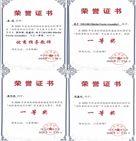 在此次大赛中,旅游与传媒学院派出了一支由1名留学生和2名中国学生组成的参赛队伍。她们分别是来自2024级国际中文教育专业的硕士研究生SEGBO Ritchie Forcia Arnaulda(贝宁籍)、梁阳燕和侯鑫悦。经过多轮激烈角逐,这支队伍凭借出色的表现脱颖而出,最终荣获一等奖。同时,指导教师唐娟也荣获了“优秀指导教师”的称号。