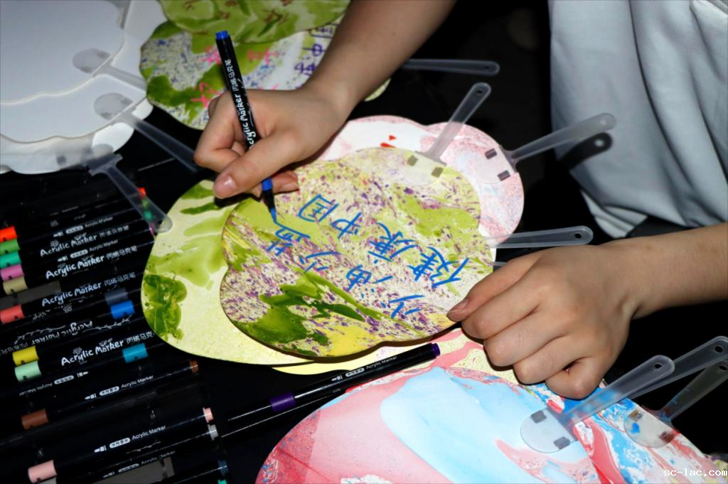 “嘞个看起好安逸哦!我也来试一哈嘛!”将军村村民陈阿姨在实践团成员龙心怡的指导下,挑选了绿色和蓝色漆料,学着滴入水中,然后小心翼翼地将扇面探入水中。“陈嬢嬢,手要稳,慢点来哈。”龙心怡在一旁提示。陈德珍小心翼翼地将扇面探入水中,缓缓提起。当陈阿姨看到自己制作的扇面呈现出流畅自然的绿色纹理时,脸上笑开了花:“哎呀,嘞个颜色好清爽!硬是比买的还好看!我回去要天天用它扇风!”