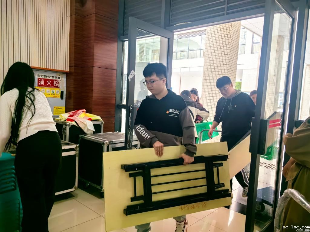 勇挑重担“搬”起来:党员同志们齐心协力,将数十套沉重的会议桌椅板凳从仓库,安全、有序地搬运至学生活动中心各预设区域。