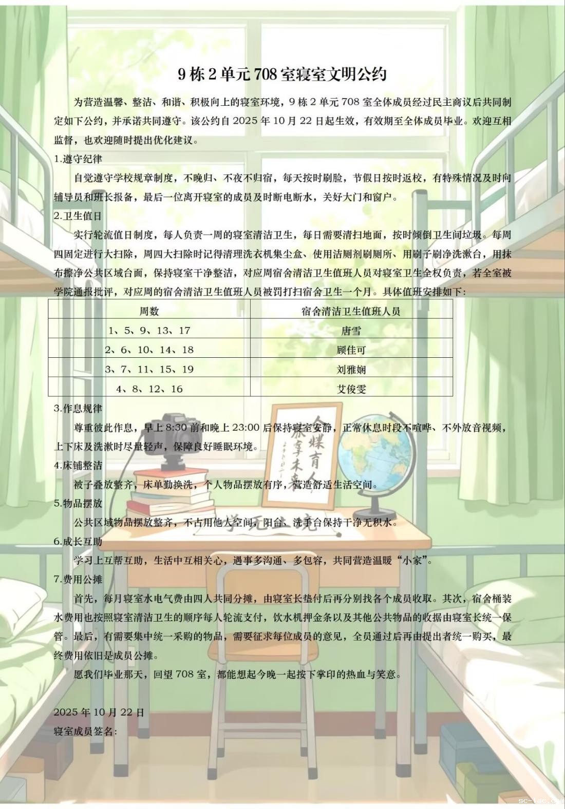 在这份公约中,卫生值日、费用公摊、奖惩机制都有明确的规定。这份详尽、民主又充满温情的公约,正是“室”界因你而不同的最好证明!