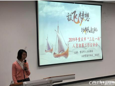 为深入宣传2019年重庆市“三支一扶”招募政策,吸引更多毕业生投身基层建功立业,为有意报考“三支一扶”项目的我校毕业生提供专业化服务,3月31日下午,由学校招生就业处主办的2019年重庆市“三支一扶”人员招募宣讲会在一教报告厅顺利举行。此次宣讲会邀请到了重庆市人力资源和社会保障局人力资源市场处张国宇主任科员担任主讲嘉宾,张老师作为重庆市人社局具体负责“三支一扶”项目的工作人员,近年来积累了丰富的工作经验,对相关政策有着深刻的理解。本场宣讲会同时也是学校走访重庆市人才大市场时商定的合作事项。