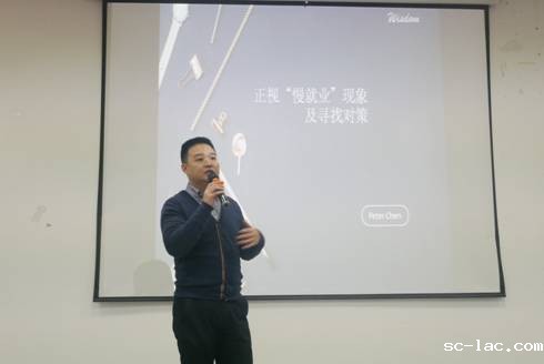 陈树平用详实的数据分析了当下慢就业现象的成因,阐释了“慢就业”学生的主要特征——犹豫不决、定位不准。接着,陈树平老师给出了自己对于“慢就业”现象的解决方案:他认为“慢就业”现象有主动和被动之分,主动“慢就业”的同学一般都是“俏专业”或者好学生,这部分同学在面试中总想表现出个人100分的优秀是不正确的,应更注重与应聘企业和职位匹配度的展示,企业更愿意录用与工作匹配程度高、沟通能力强、抗压能力强的毕业生。针对综合条件稍差的被动“慢就业”同学,陈老师建议一是做好定位,清楚认识自己的优缺点;二是化被动为主动,不断面试,在面试中不断总结提高,由量变促成质变;三是要坚定信念,只要坚持不断面试,最终都会实现就业。