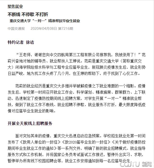 范莉的就业经历是重庆交大多措并举破解疫情之下就业难题的一个缩影。疫情发生后,学校第一时间召开就业工作会,科学谋划、精准施策、群策群力、上下联动,迅速制定了疫情防控期间线上招聘方案,对学生开展“一对一”精准就业帮扶,做到了就业工作不断线、就业招聘不停歇、就业服务不打折,最大限度降低疫情对应届毕业生就业的影响。