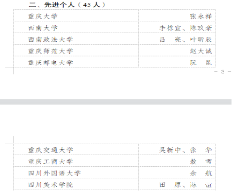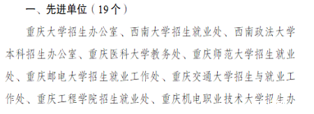 为表彰先进、宣传典型,充分激励和调动各在渝高校和普通高校招生工作者的积极性,2021年10月26日,重庆市教委下发《重庆市教育委员会关于普通高校招生工作先进集体和先进个人的通报》。其中,我校招生与就业工作处荣获“重庆市普通高校招生工作先进集体”,吴新中、张华荣获“重庆市普通高校招生工作先进个人”。