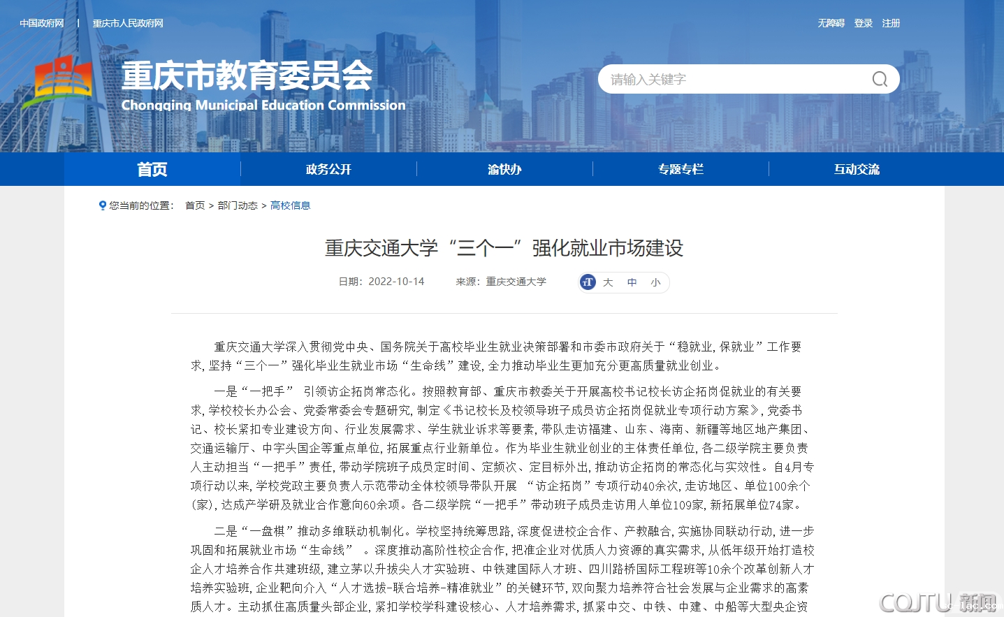 一是“一把手” 引领访企拓岗常态化。按照教育部、重庆市教委关于开展高校书记校长访企拓岗促就业的有关要求,学校校长办公会、党委常委会专题研究,制定《书记校长及校领导班子成员访企拓岗促就业专项行动方案》,党委书记、校长紧扣专业建设方向、行业发展需求、学生就业诉求等要素,带队走访福建、山东、海南、新疆等地区地产集团、交通运输厅、中字头国企等重点单位,拓展重点行业新单位。作为毕业生就业创业的主体责任单位,各二级学院主要负责人主动担当“一把手”责任,带动学院班子成员定时间、定频次、定目标外出,推动访企拓岗的常态化与实效性。自4月专项行动以来,学校党政主要负责人示范带动全体校领导带队开展“访企拓岗”专项行动40余次,走访地区、单位100余个(家),达成产学研及就业合作意向60余项。各二级学院“一把手”带动班子成员走访用人单位109家,新拓展单位74家。