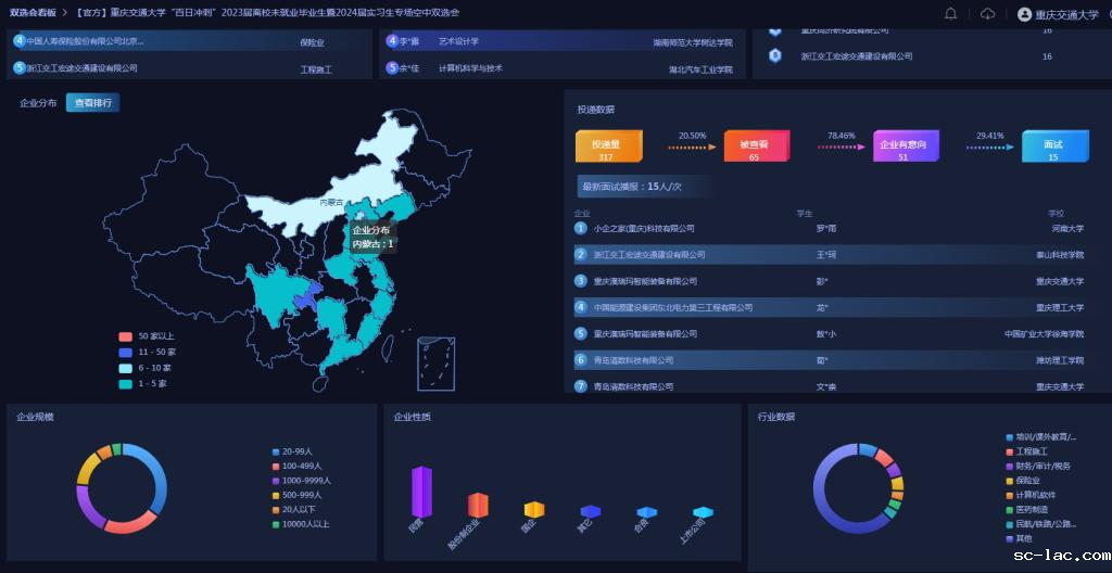 此次双选活动中,老伟德网上娱乐通过第三方平台创建了“老伟德网上娱乐招聘专栏”,来自建筑、制造、交通运输、教育培训、互联网、房地产、计算机软件、金融等多个行业的56家企事业单位参与空中双选会,提供工作岗位共计189个,招聘人数1849人,工作岗位需求覆盖我校各学历层次。参会的四川路桥华东建设有限责任公司、浙江交工宏途交通建设有限公司、中国能源建设集团东北电力第三工程有限公司、重庆同济研究院有限公司、中国平安财产保险股份有限公司等均为与我校专业契合度较高的优质单位。本次双选会呈现出质量层次高、地域分布广、岗位多样化等特点。学校265名毕业生参加招聘,累计投递简历近400份,部分毕业生与单位达成初步就业意向。双选会结束后,企业将通过简历审核,对有意向的毕业生发起面试邀约,完成面试、签约等后续工作。