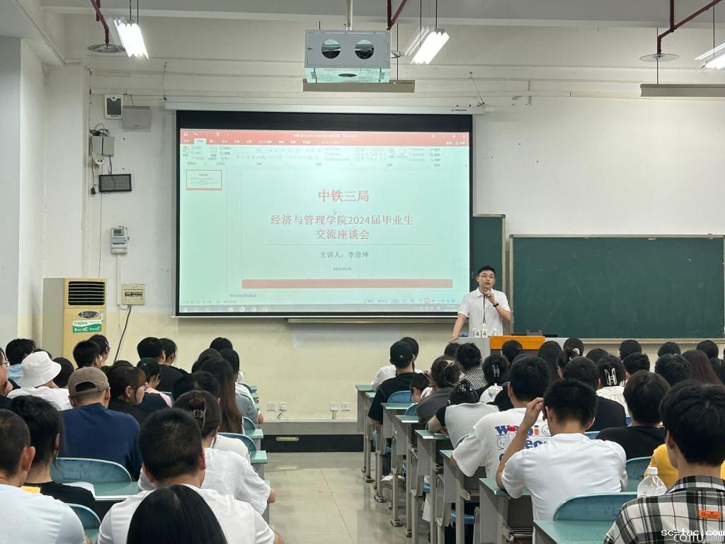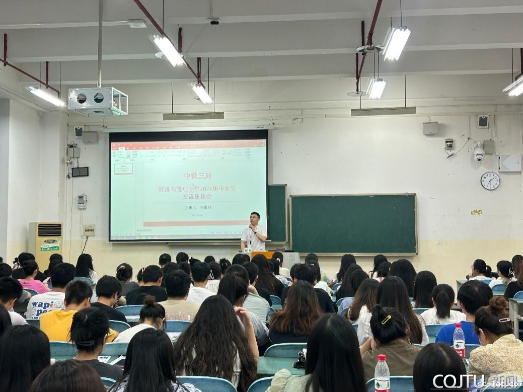 为全面了解2024届毕业生就业意愿和服务需求,帮助毕业生顺利就业,2023年9月10日晚,经济与管理学院于第三教学楼30103教室召开中国中铁三局集团有限公司2024届毕业生“面对面”交流座谈会,详细了解毕业生就业意向,针对性提供就业指导,促进毕业生更好就业。学院党委副书记张韩笑、中铁三局企业代表出席会议,2024届本科毕业班辅导员和学生代表近200人到场参会,会议由中铁三局桥隧公司人力资源部副部长李进坤主讲。