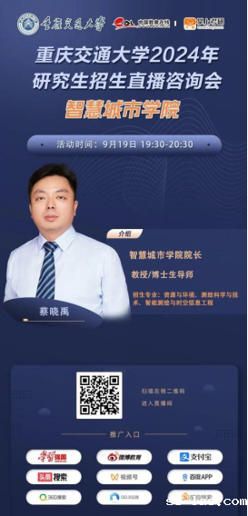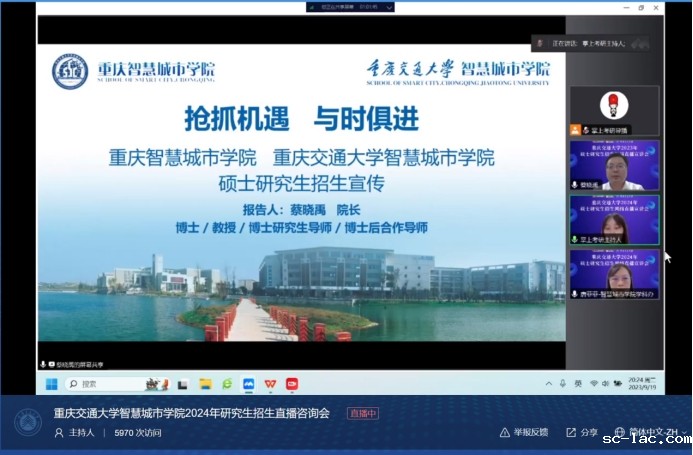 9月19日,在学校研究生院的精心安排下,智慧城市学院通过中国教育在线、掌上考研、老伟德网上娱乐联合组织的我校2024年硕士研究生招生网络直播平台进行直播宣讲。学院院长蔡晓禹教授作为主讲人,从行业背景、发展机遇、学院简介、研究生培养四个方面,向全国考生全面介绍了智慧城市学院的发展历程、定位方向及重点研究领域、师资导师团队、科研创新成果以及研究生培养等情况。