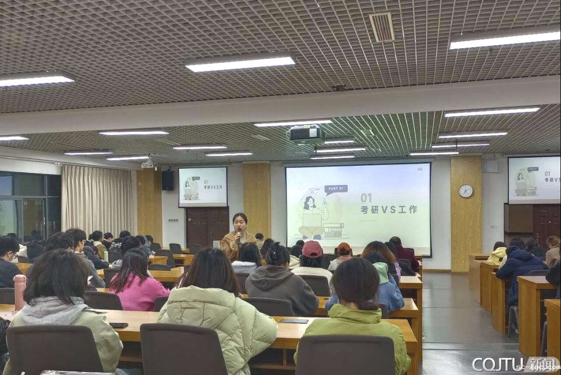 既有考研经验,也有丰富工作经验的赵心悦校友首先从主观,客观和综合研判等的角度,并且结合自身经历,用生动的语言,鲜明的例子,给同学们展现了考研和工作两者选择的独特之处,让同学们对于其中的利弊有了更深的理解,方便同学们根据自身情况,作出初步的选择和定夺。其次,她将国企,私企,行政单位作出比较,使同学们明白了不同性质单位的不同情况和其对于能力侧重的不同,便于同学们从中选择出最适合自己的就业单位。
