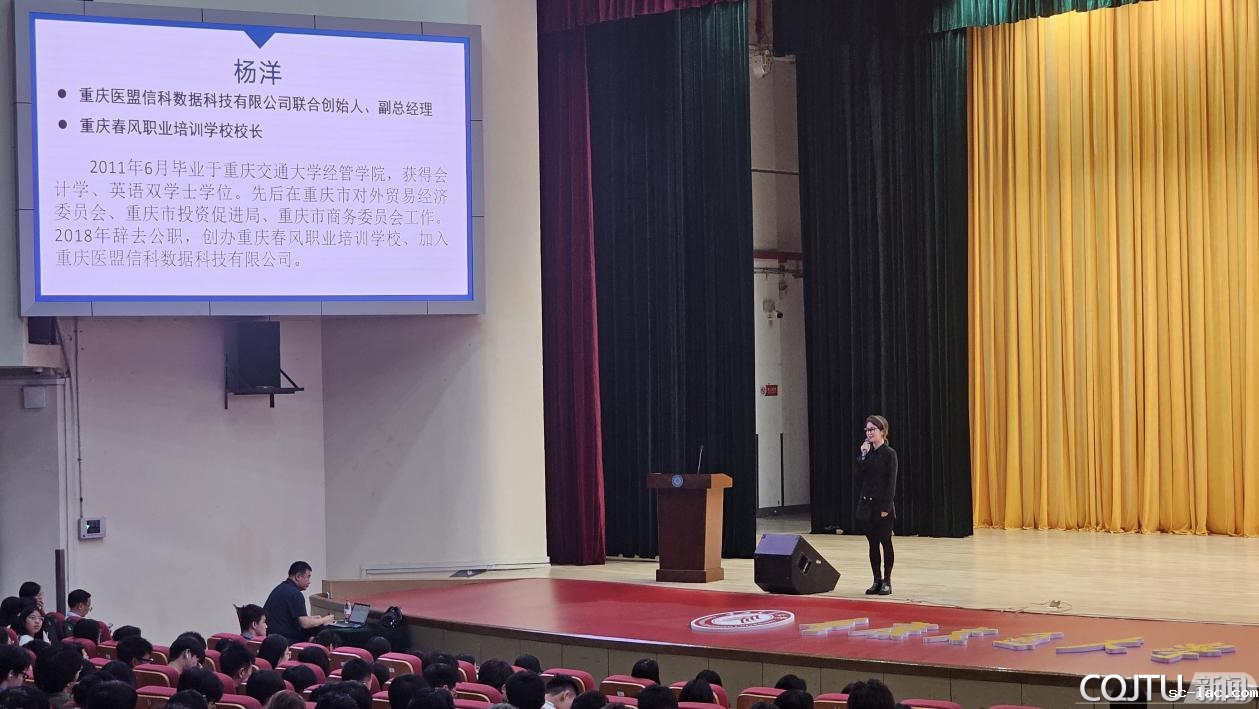 在讲堂上,杨洋校友首先回顾了自己的学习经历和职业生涯,她从自身经历出发鼓励同学们要敢于面对挑战,同时也要注重自我提升和不断学习,以适应不断变化的就业市场。同时,她结合自己在重庆市有关部门工作、辞职创业等职场经验和创业经历,为同学们解读了当前就业市场特点、职场趋势和人才需求等情况。