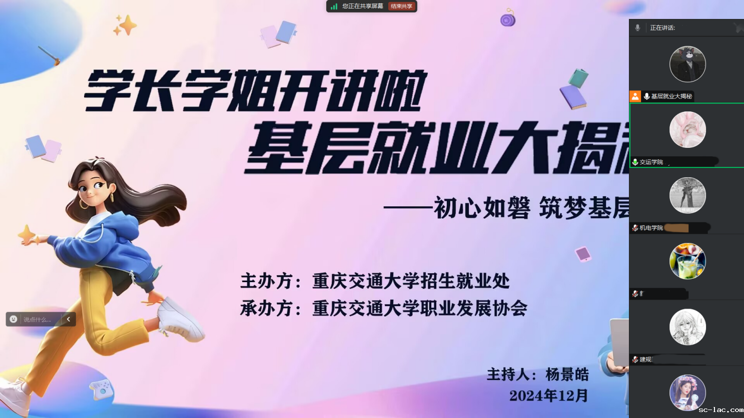 12月19日晚,“学长学姐开讲啦之基层就业大揭秘”线上分享会成功举行。本次分享会邀请到了2024届土木工程学院毕业生杨帆(山西省忻州市选调生)、旅传学院毕业生陈合娇(新疆生产建设兵团西部计划志愿者)、河海学院毕业生谢文榕(四川省成都市选调生)三位校友担任分享嘉宾,与学弟学妹们就基层就业政策支持、工作内容、职业发展等问题进行了充分交流。此次活动由学校招生就业处主办,职业规划协会承办,近400名同学在线参会。