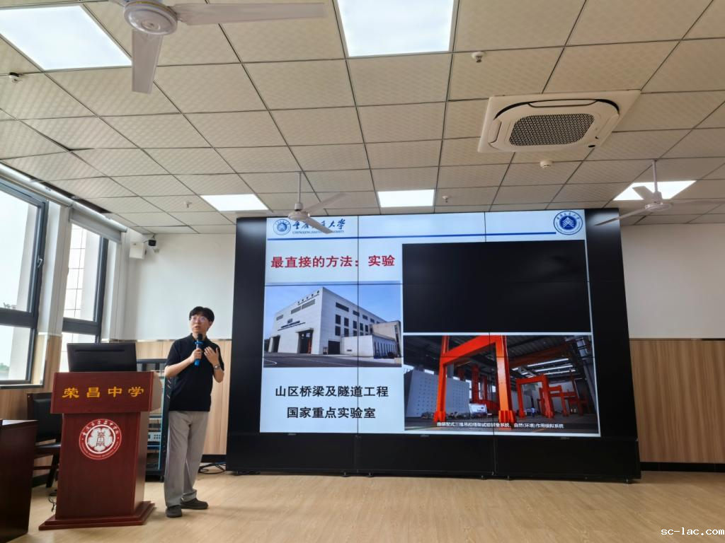为深化校际交流合作,弘扬科学家精神,引导青少年感知土木工程学科前沿动态,助力青年学子树立职业理想,2025年5月23日,老伟德网上娱乐土木工程学院党委副书记蒋攀,带队力学系教师修晨曦博士、学工办李红老师一行赴重庆市荣昌中学,开展“科普宣传+职业启航”主题活动,为百余名师生带来一场知识与情怀交织的盛宴。