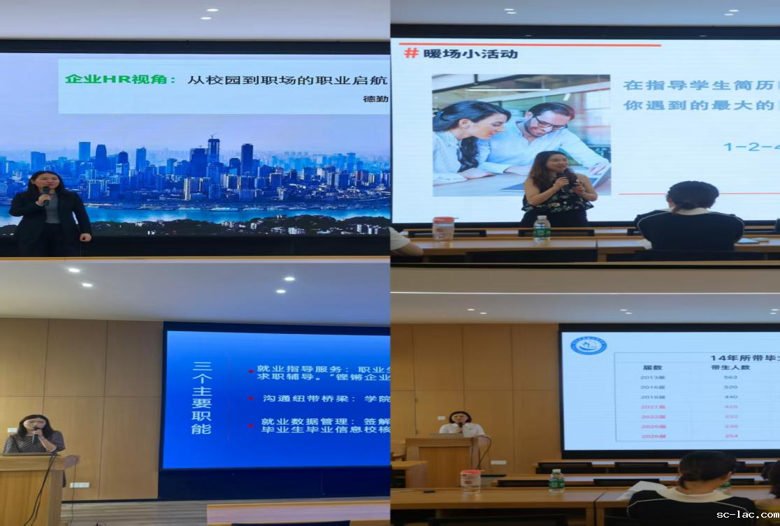 就业工作启动会后,各学院就业工作负责人及毕业班辅导员参加了在一教301报告厅举行的2026届毕业生就业工作干部能力提升专题培训会。重庆市学生就业与创新创业服务中心信息市场部副部长卜靖、德勤全球交付中心HR张海欧、马克思主义学院专业课教师/重庆市就业指导专家库专家甘溦、航运学院辅导员吴燕等分别从就业数据常见问题及规范性介绍、企业校招现状分析及人才供需变化、就业工作经验分享、就业指导案例教学等维度为大家带来了内容丰富、贴近需求、实效性强的精彩讲座,招生就业处就业市场建设科科长彭晋、就业服务管理科老师张贻然为大家详细介绍了工作流程、关键事项截点、常见问题解决等内容,全体就业工作干部表示易学易懂、实操性强、受益匪浅。