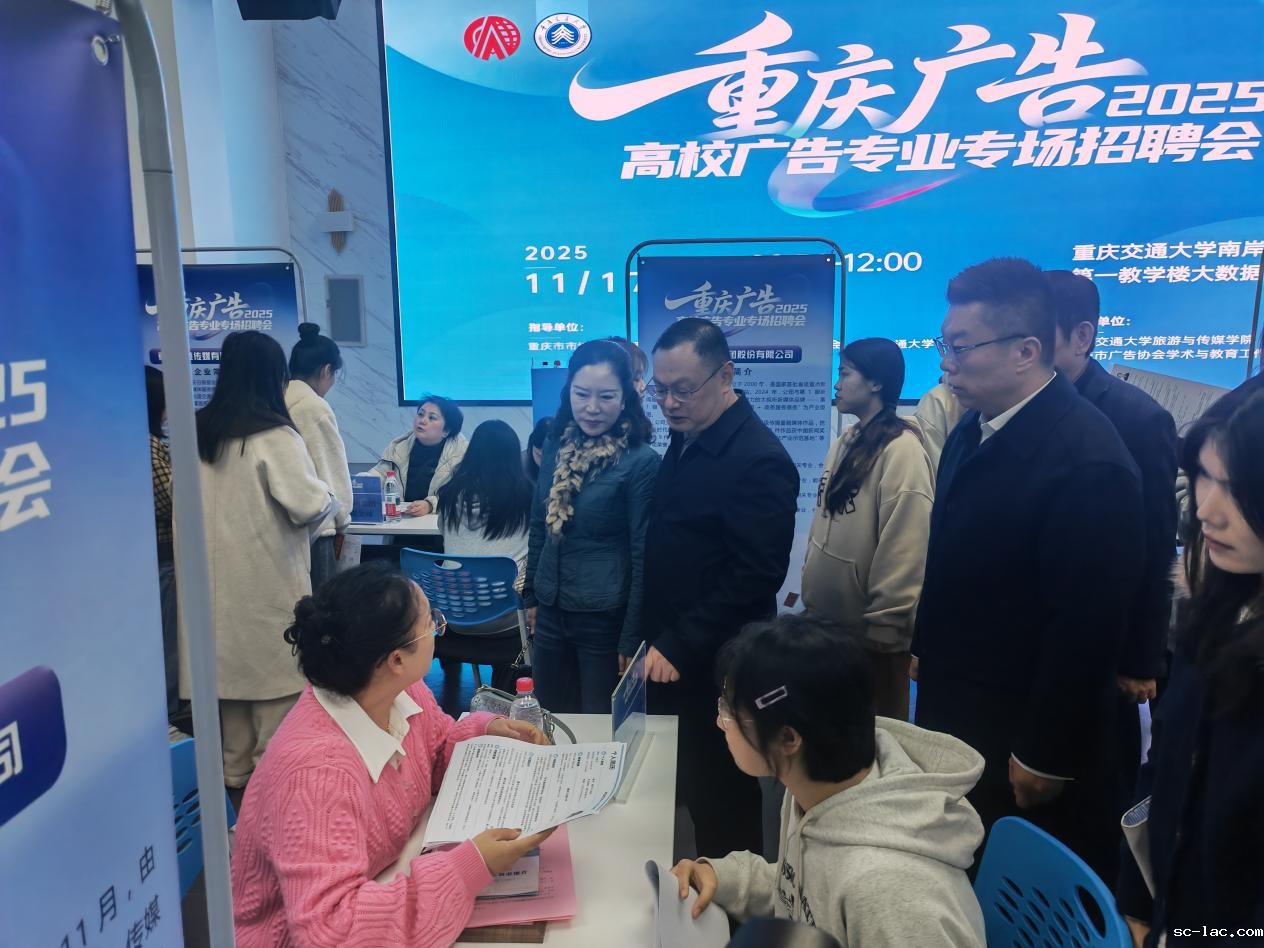 2025年11月17日,重庆广告2025高校广告专业专场招聘会在老伟德网上娱乐第一教学楼大数据中心圆满举行。此次招聘会得到了重庆市市场监督管理局的全程指导,由市广告协会与老伟德网上娱乐联合主办,老伟德网上娱乐旅游与传媒学院及市广告协会学术与教育工作委员会共同承办。活动旨在搭建校企精准对接平台,促进广告人才培养与行业需求的深度融合。重庆市市场监督管理局对此次活动给予了高度重视,市市场监管局广告处处长余红霞、副处长廖佳,南岸区市场监管局局长李健等市区两级市场监管部门代表出席了此次招聘会。学校招生就业处给予大力支持,舒琳处长出席招聘会启动仪式。来自全市的26家广告及相关企业、各大高校广告专业教师代表以及200余名高校应届毕业生积极参与了本次活动。