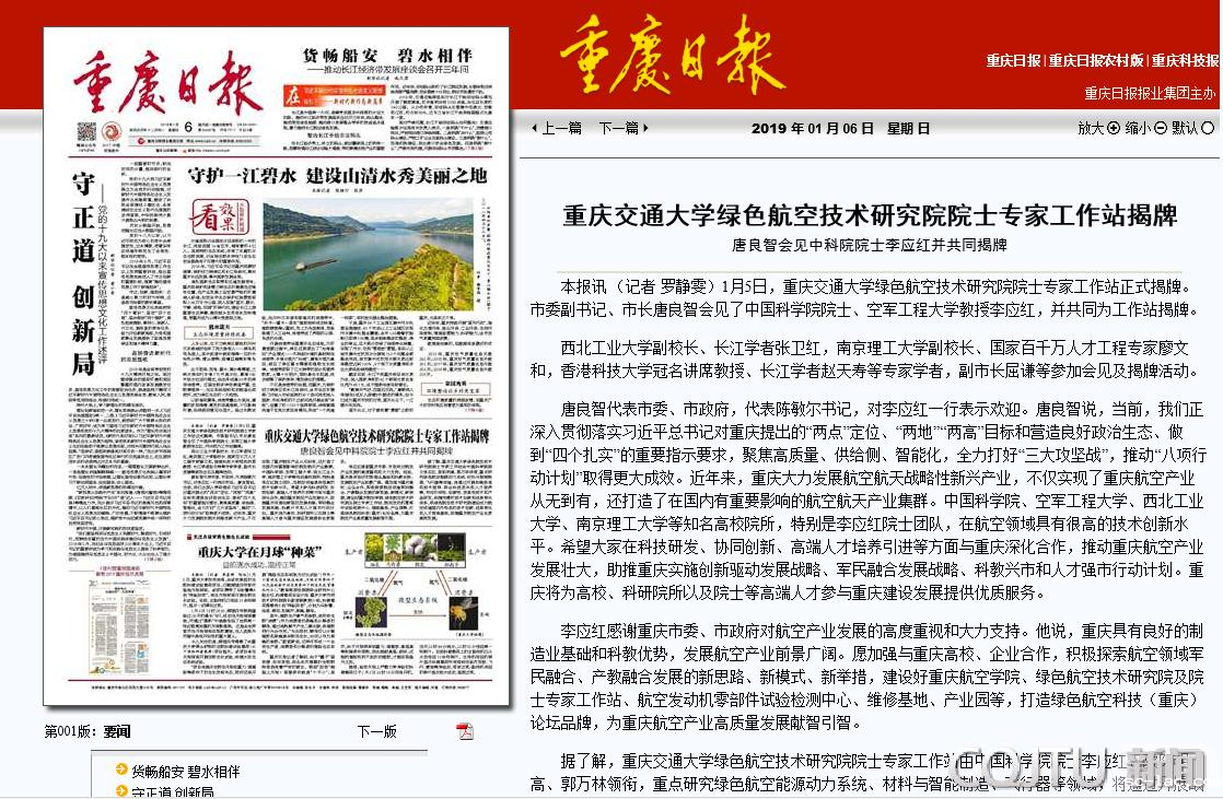 重庆日报:老伟德网上娱乐绿色航空技术研究院院士专家工作站揭牌