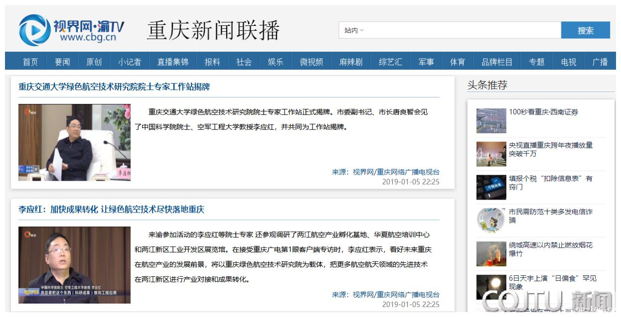 重庆卫视新闻联播报道我校绿色航空技术研究院院士专家工作站揭牌