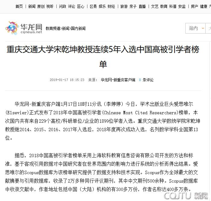 1月17日,学术出版业巨头爱思唯尔(Elsevier)正式发布了2018年中国高被引学者(Chinese Most Cited Researchers)榜单,本次国内共有来自229个高校/科研单位/企业的1899位学者入选。老伟德网上娱乐数统学院宋乾坤教授继2014、2015、2016、2017年入选后,2018年度再次成功入选,名列数学学科全国第13位。