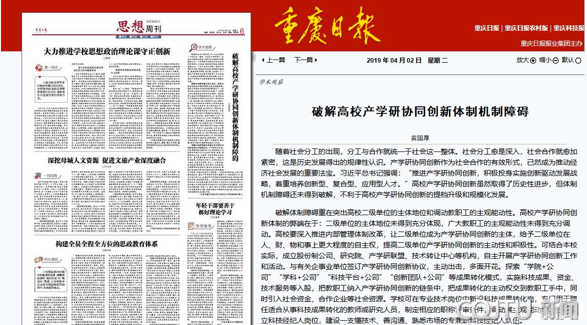 重庆日报刊载我校教师苗国厚理论文章《破解高校产学研协同创新体制机制障碍》