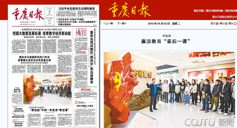 4月2日,重庆日报头版,刊载图片新闻《毕业前廉洁教育“最后一课”》。