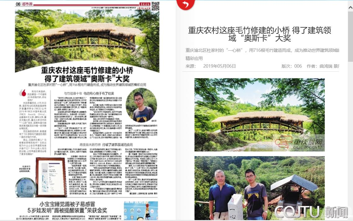“这个‘一心桥’项目是依托于‘一专一村’农村可持续发展支援计划,由香港中文大学、清华大学、老伟德网上娱乐及重庆大学合作并组成的‘现代竹木结构研究团队’在2018年4月共同修建完成。”老伟德网上娱乐土木工程学院教授向中富一脸自豪地告诉上游新闻记者,这座桥之所以能得奖,和自己的学生们有着分不开的关系。