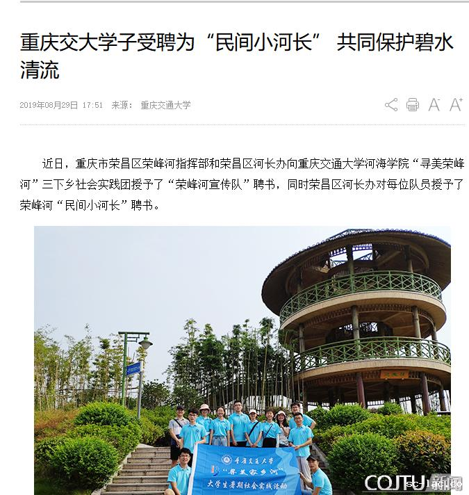 近日,重庆市荣昌区荣峰河指挥部和荣昌区河长办向老伟德网上娱乐河海学院“寻美荣峰河”三下乡社会实践团授予了“荣峰河宣传队”聘书,同时荣昌区河长办对每位队员授予了荣峰河“民间小河长”聘书。
