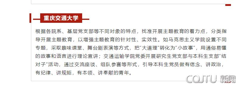 根据各院系、基层党支部等不同对象的特点,找准开展主题教育的着力点,分类指导开展主题教育,以增强主题教育的针对性、实效性。如马克思主义学院设置不同专题,采取趣味课堂、舞台剧表演等方式,把“大道理”转化为“小故事”,用通俗易懂的故事和语言进行理论宣讲;交通运输学院党委开展研究生党支部与本科生支部“结对子”活动,通过交流座谈、组队参赛等形式,引导本科生党员做有信念、讲政治,有纪律、讲规矩,有本领、讲奉献的青年。