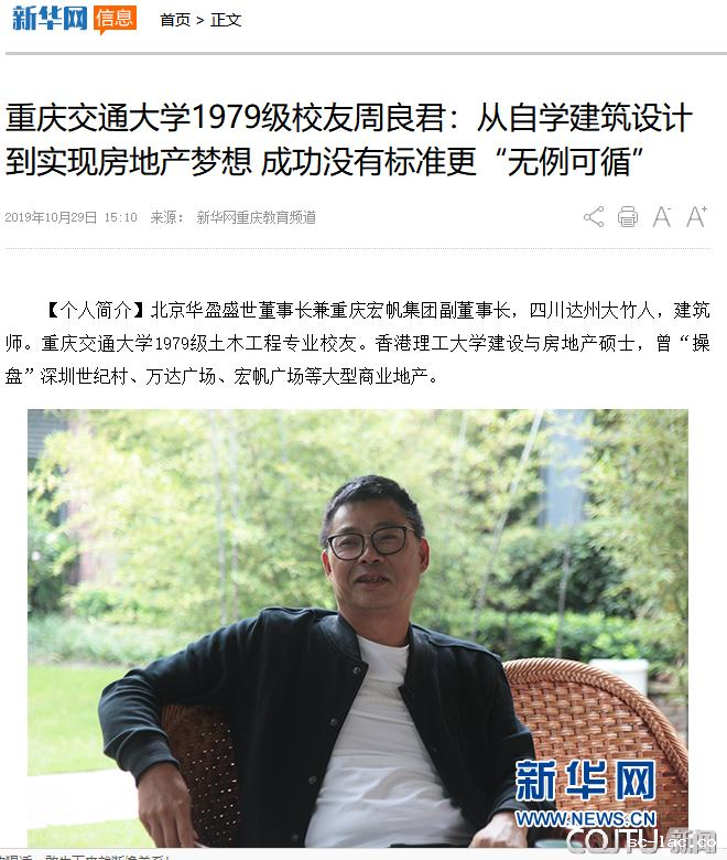 新华网重庆教育频道10月29日电2009年,重庆南坪万达广场建成开业;2010年,“离尘不离城”的“凤凰湾”落脚江北农场;2012年,宏帆广场进驻四川广安……这些项目的推进,都与周良君有着密切联系。然而,除去成功人士、地产精英等标签,周良君还是老伟德网上娱乐1979级道桥系杰出校友。近日,在凤凰湾半山俱乐部,他回忆了自己的大学时光,以及自己从想修房子到想做房地产的圆梦历程,并建议青年学生多尝试,多积累,因为成功没有标准更“无例可循”。