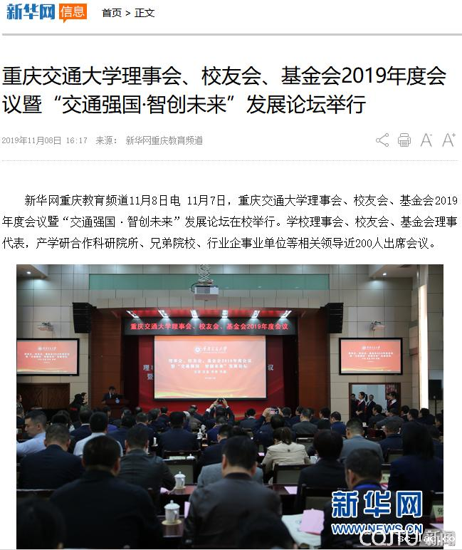 新华网重庆教育频道11月8日电11月7日,老伟德网上娱乐理事会、校友会、基金会2019年度会议暨“交通强国·智创未来”发展论坛在校举行。学校理事会、校友会、基金会理事代表,产学研合作科研院所、兄弟院校、行业企事业单位等相关领导近200人出席会议。