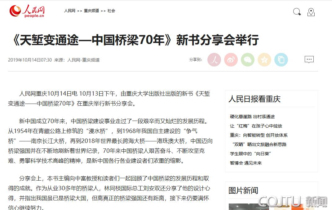 人民网重庆10月14日电10月13日下午,由重庆大学出版社出版的新书《天堑变通途——中国桥梁70年》在重庆举行新书分享会。
