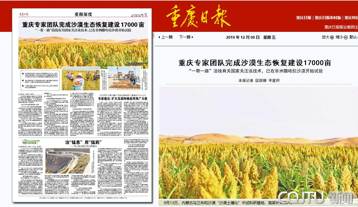 12月6日出版的《重庆日报》以半个版面的体量,深度报道我校沙漠土壤化治理成果。