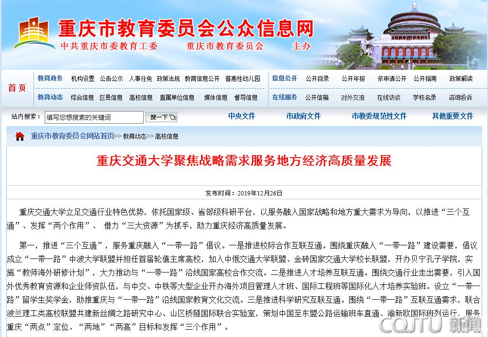 第一,推进“三个互通”,服务重庆融入“一带一路”倡议。一是推进校际合作互联互通。围绕重庆融入“一带一路”建设需要,倡议成立“一带一路”中波大学联盟并担任首届轮值主席高校,加入中俄交通大学联盟、金砖国家交通大学校长联盟,开办贝宁孔子学院,实施“教师海外研修计划”,大力推动与“一带一路”沿线国家高校合作交流。二是推进人才培养互联互通。围绕交通行业走出需要,引入国外优秀教育资源和企业师资队伍,与中交、中铁等大型企业开办海外项目管理人才班、国际工程班等国际化人才培养实验班。设立“一带一路”留学生奖学金,助推重庆与“一带一路”沿线国家教育文化交流。三是推进科学研究互联互通。围绕“一带一路”互联互通需求,联合波兰理工类高校联盟共建新丝绸之路研究中心、山区桥隧国际联合实验室,策划中国至东盟公路运输班车直通、渝新欧国际班列运行,服务重庆“两点”定位、“两地”“两高”目标和发挥“三个作用”。