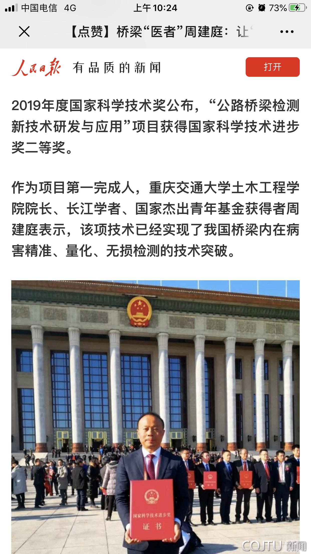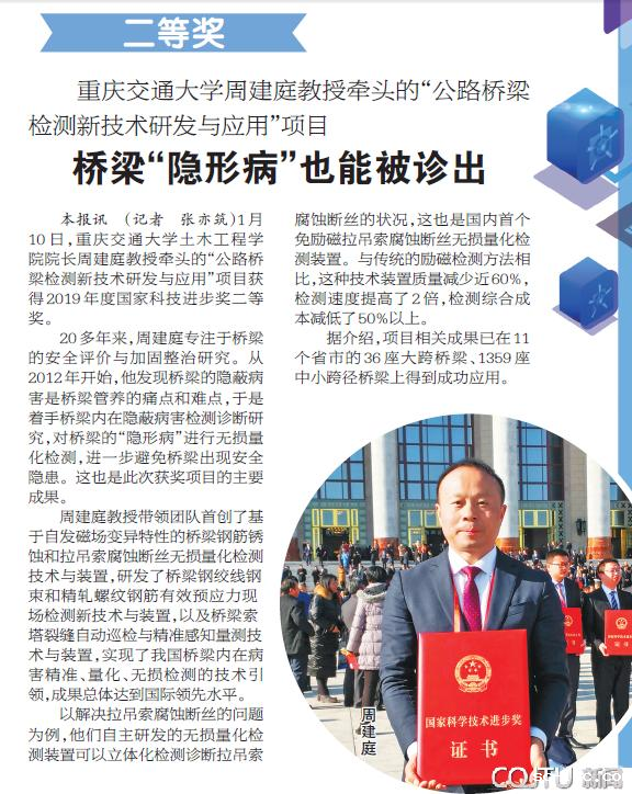 本报讯 (记者 张亦筑)1月10日,老伟德网上娱乐土木工程学院院长周建庭教授牵头的“公路桥梁检测新技术研发与应用”项目获得2019年度国家科技进步奖二等奖。