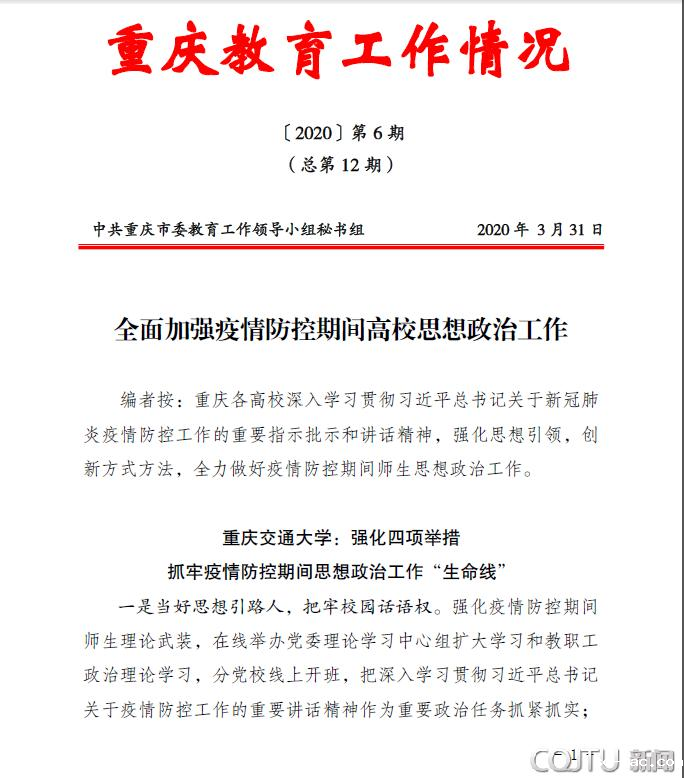 一是当好思想引路人,把牢校园话语权。强化疫情防控期间师生理论武装,在线举办党委理论学习中心组扩大学习和教职工政治理论学习,分党校线上开班,把深入学习贯彻习近平总书记关于疫情防控工作的重要讲话精神作为重要政治任务抓紧抓实;发布致全校各级党组织、广大党员干部、全体学子的公开信,引导师生正确认识、科学理性对待疫情;组织各党支部开展“战疫情抓发展,守初心担使命”线上主题党日活动,带头做好疫情防控和本职工作。
