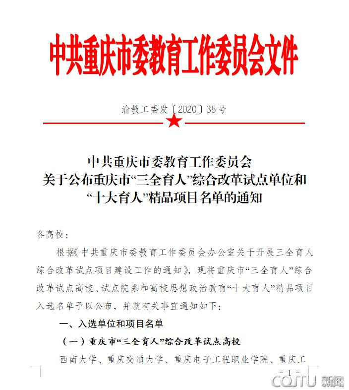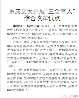 近日,市委教育工委公布了重庆市“三全育人”综合改革试点单位和“十大育人”精品项目名单,我校成功入选“三全育人”综合改革试点高校,同批入选的还有西南大学、重庆电子工程职业学院、重庆工业职业技术学院三所高校。