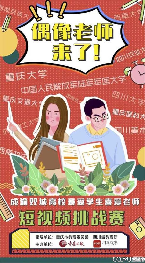 本报讯(记者李星婷)她是集“美貌与智慧于一身”的工科女博士;他是用金刚葫芦娃玩转高数原理的数学老师;他是一上课连地上、窗户上都坐满学生的法学专家……9月3日,由重庆市教委、四川省教育厅指导,重庆日报和川报观察客户端主办的《偶像老师,来了!》——2020成渝地区双城经济圈高校“最受学生喜爱老师”短视频挑战赛(活动海报见左图),正式开启。