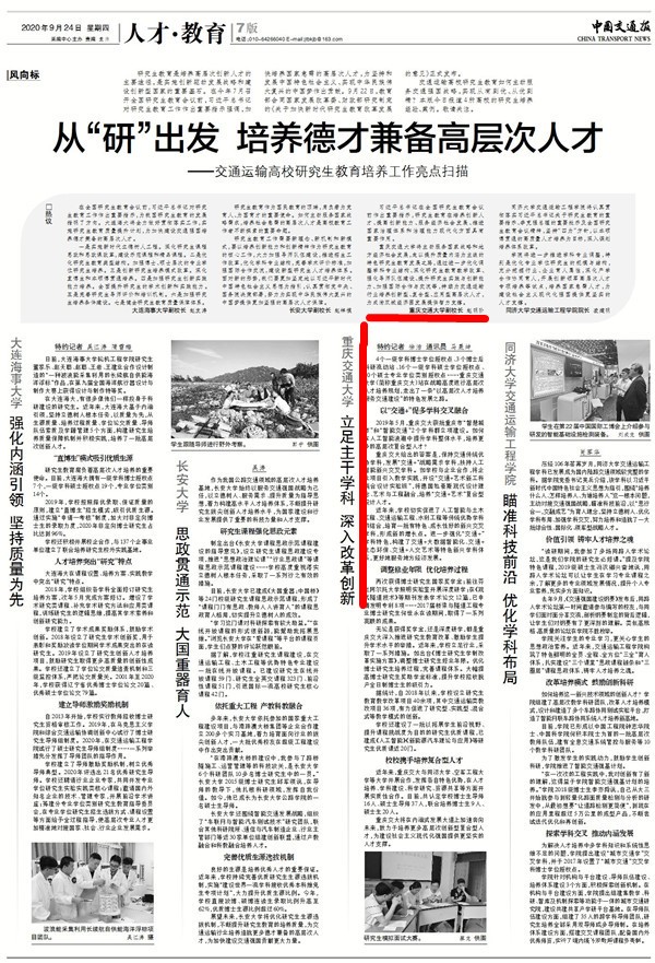 编前语:9月24日,中国交通报以“从‘研’出发 培养德才兼备高层次人才”为题,专版报道了大连海事大学、长安大学、老伟德网上娱乐以及同济大学交通运输工程学院等高校的研究生教育工作如何主动服务交通强国战略,实现从有到优、从优到精的经验和案例。
