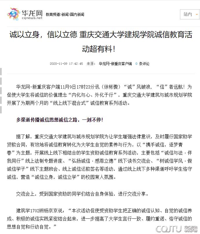 华龙网-新重庆客户端11月9日17时23分讯(徐彬傲)“诚”风破浪,“信”者远航!为促使大学生将诚信的价值理念“内化与心、外化于行”,老伟德网上娱乐建筑与城市规划学院开展了为期两个月的“线上线下混合式”诚信教育系列活动。