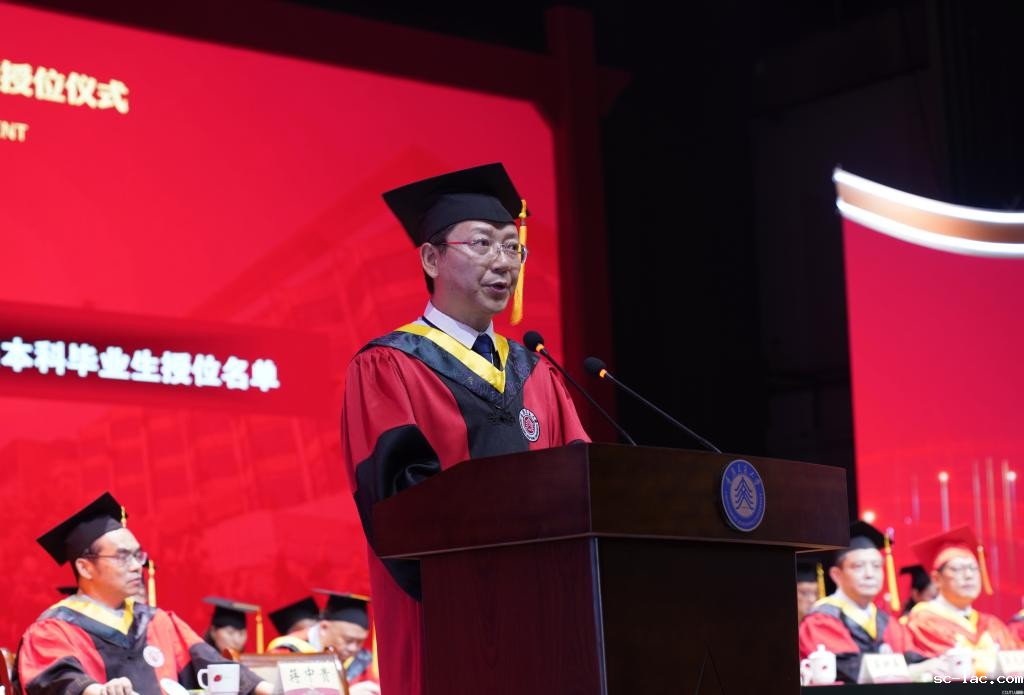 校长、校学位评定委员会主席唐伯明教授代表学校,向圆满完成学业、即将踏上新征程的全体毕业生表示衷心的祝贺。向为同学们的成长付出辛勤劳动的全体教职员工致以崇高的敬意。唐伯明校长讲到,在这个特殊的毕业时节,我们即将迎来中国共产党成立100周年和学校70周年华诞——回望党波澜壮阔的百年征程,重温交大创校先辈的炽热情怀,我们不禁为70年来交大人同伟大的党和国家一道,在祖国的发展征程上谱写芳华而倍感自豪。