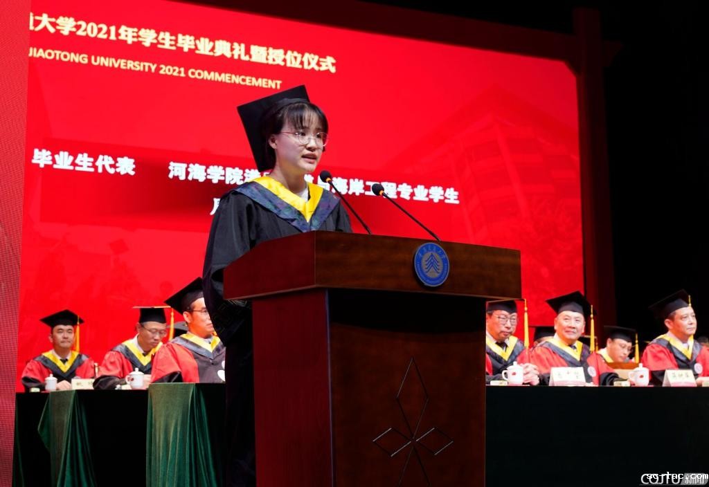 “交大教会我顺应本心、坚持热爱,交大教会我找准定位、砥砺思想,交大教会我勇于担当、夯实本领!”河海学院2021届本科毕业生代表周海怡说,四年来,我们在李子湖畔夜跑、在湖滨广场漫步,在交大度过了一千多个有汗水、泪水,更有成长与蜕变的日日夜夜;我们共同见证了山区桥梁及隧道工程国家重点实验室的落成,更为我校“沙漠土壤化”生态修复技术而自豪。不论去到哪里,未来的我们都将铭记“明德行远、交通天下”之校训精神,无愧于青春、无愧于时代。在中国共产党成立100周年之际,我们将以更强的历史责任感和使命感,不负党对新时代青年的无限厚望,让青春与党同行!