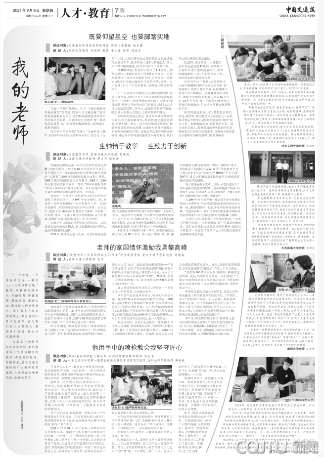 “三寸粉笔,三尺讲台系国运;一颗丹心,一生秉烛铸民魂。”教师,承载着传播知识、传播思想、传播真理,塑造灵魂、塑造生命、塑造新人的时代重任。我们每个人在求学道路上,都会遇到心目中的恩师,成为我们的人生领路人,激励我们奋进,对生活充满热爱。在第37个教师节即将来临之际,我们邀请部分交通运输院校教师,讲述恩师教诲、师德传承,展示交通运输院校广大教师爱党爱国、仁爱奉献的精神风貌,致敬教师节。