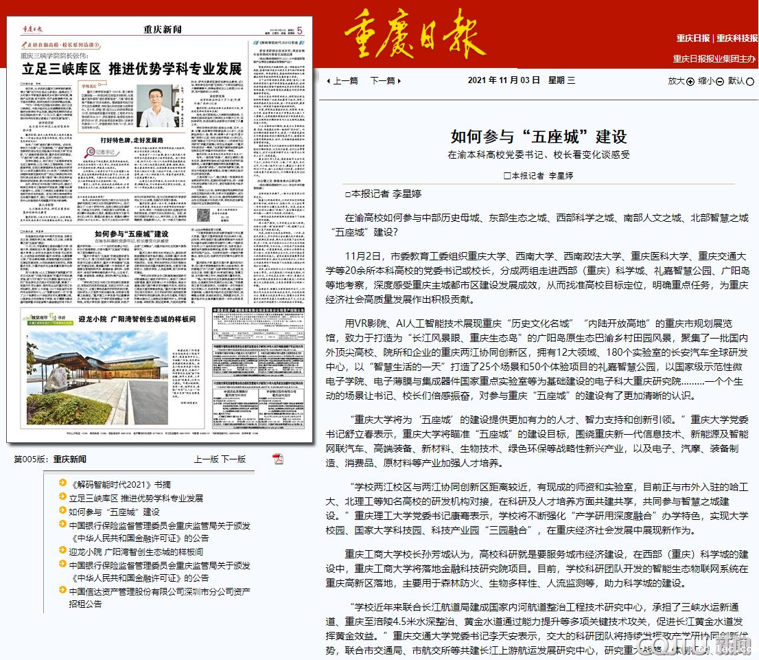 “学校两江校区与两江协同创新区距离较近,有现成的师资和实验室,目前正与市外入驻的哈工大、北理工等知名高校的研发机构对接,在科研及人才培养方面共建共享,共同参与智慧之城建设。”重庆理工大学党委书记康骞表示,学校将不断强化“产学研用深度融合”办学特色,实现大学校园、国家大学科技园、科技产业园“三园融合”,在重庆经济社会发展中展现新作为。