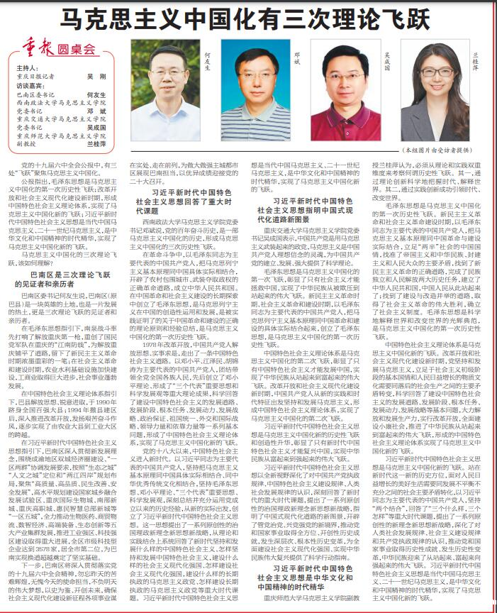 西南政法大学马克思主义学院党委书记邓斌说,党的百年奋斗历史,是一部马克思主义中国化的历史,形成马克思主义中国化的三次历史性飞跃。