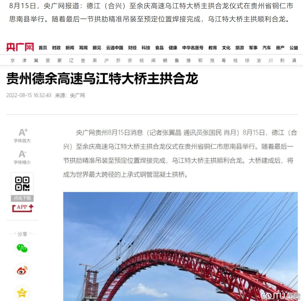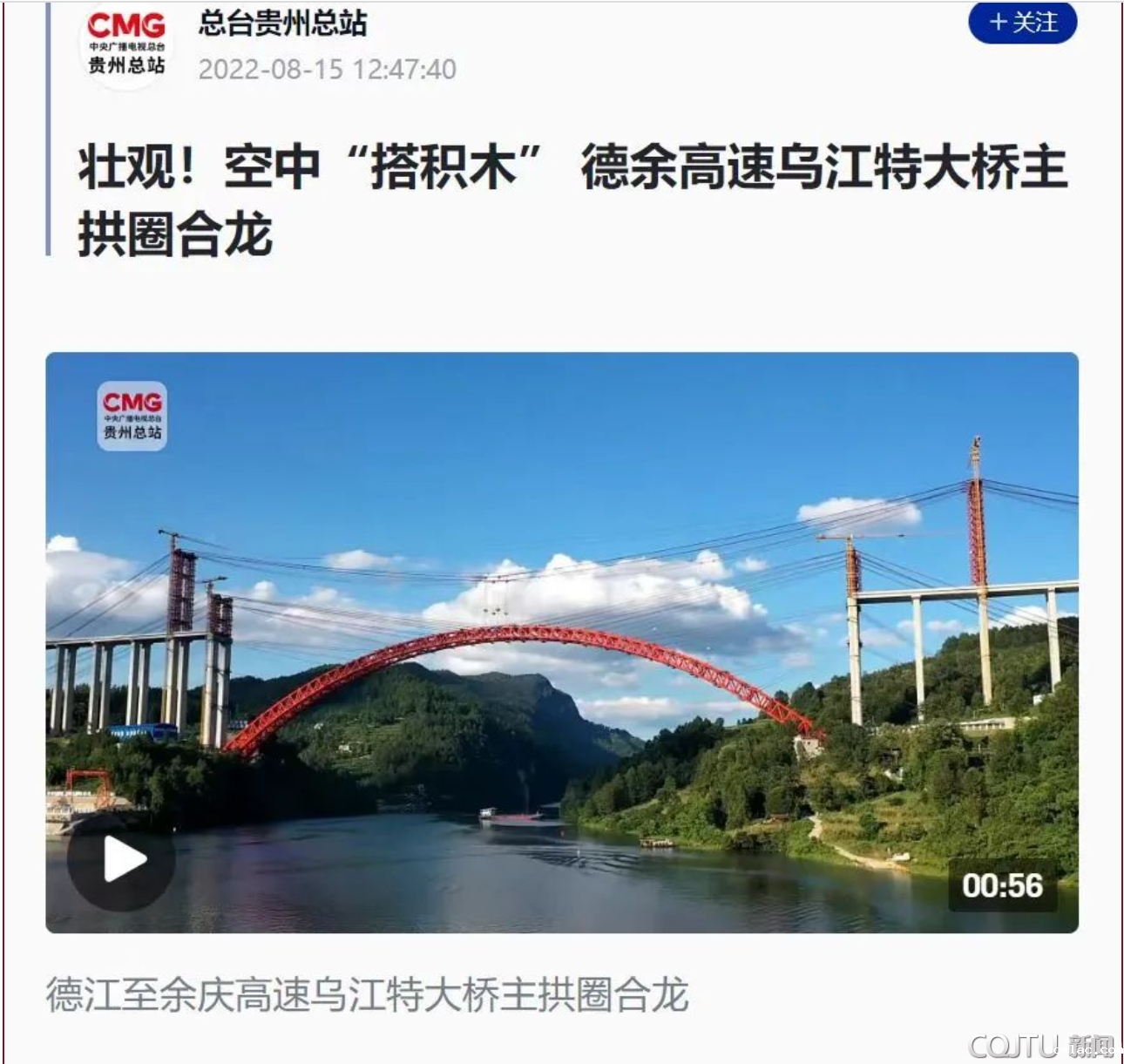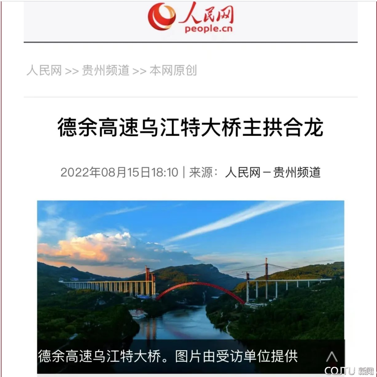 余乌江特大桥的顺利合龙,引起了社会的广泛关注。央视第1频道、央视第2频道、央视第4频道、央视第13频道、人民日报、经济日报、新华社、中国交通报、桥梁杂志等20余家主流媒体发布了乌江特大桥顺利合龙的消息。