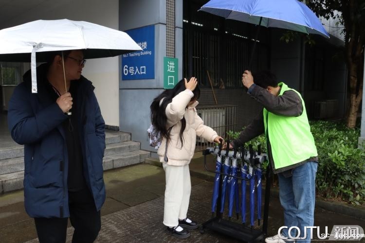 “外面雨很大,同学这里有伞可以使用。我们是智慧城市学院志愿服务队的,有需要帮助的地方可以给我们讲。”